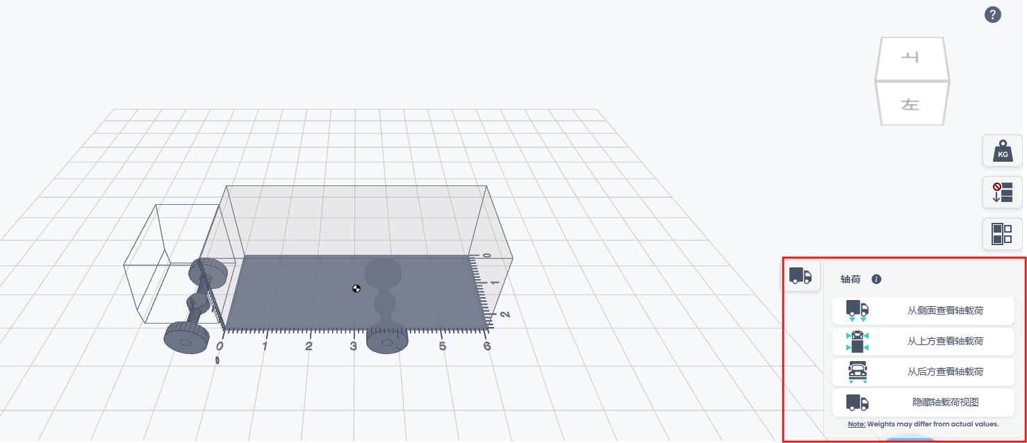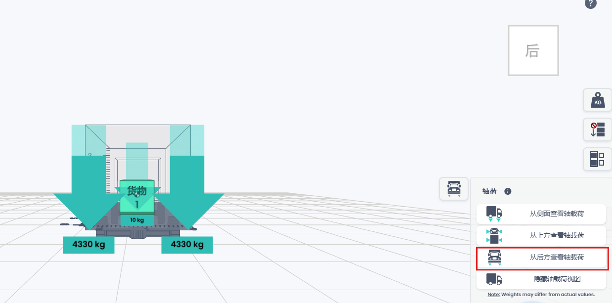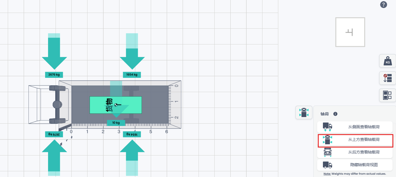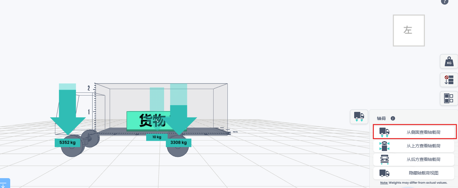 该视图汇总并标注所有左侧车轴和右侧车轴的总载荷(单位遵循您的单位设置:千克或磅)。当货物位置变化时,数值会实时更新。
