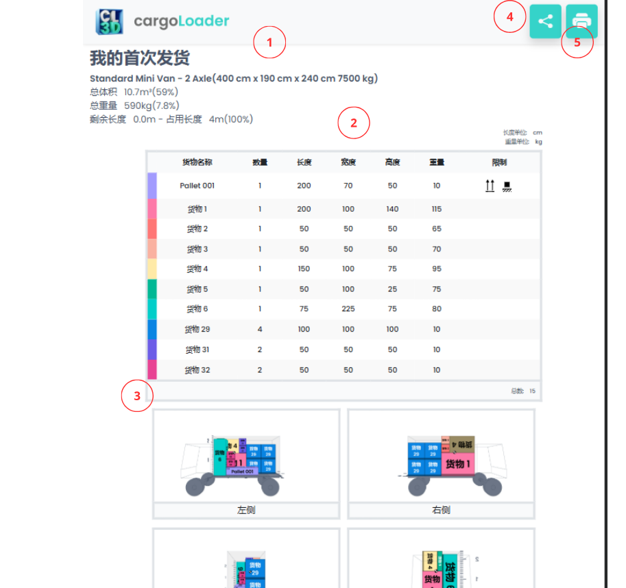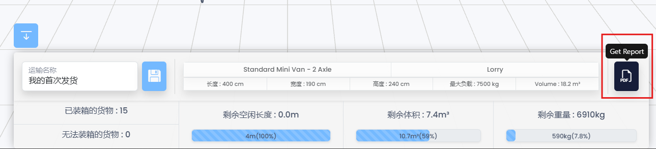 完成装运后,点击底部面板中的“获取报告”(PDF 图标)按钮。此操作将跳转至报告页面(https://app.cargoloader3d.com/Report)。