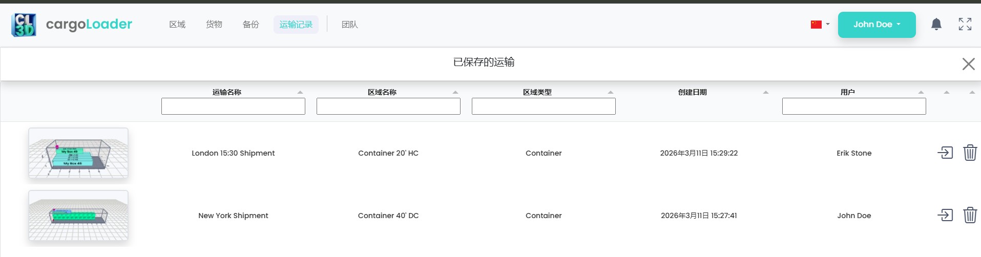 保存后,您可以通过顶部菜单中的“装运”选项卡访问所有已保存的项目;在列表中,点击任意行或装运名称即可打开该装运的详细页面。