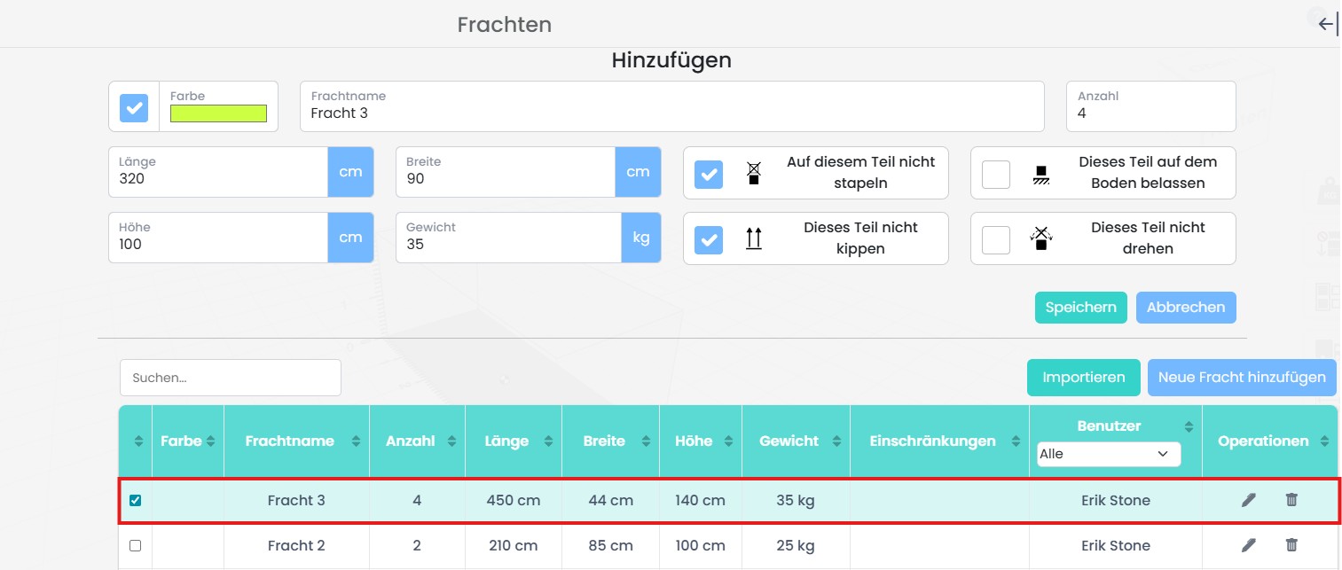 Verwenden Sie das Add Item Panel, um die Eigenschaften des Elements zu aktualisieren. Alle Attribute können geändert werden, einschließlich Box Name, Color, Count, Length, Width, Height, Weight und jeglicher Einschränkungen des Elements (wie Stapeln, Kippen, Drehen oder Platzierung auf dem Boden). Nachdem Sie die erforderlichen Werte angepasst haben, klicken Sie auf Save, um die Änderungen anzuwenden.