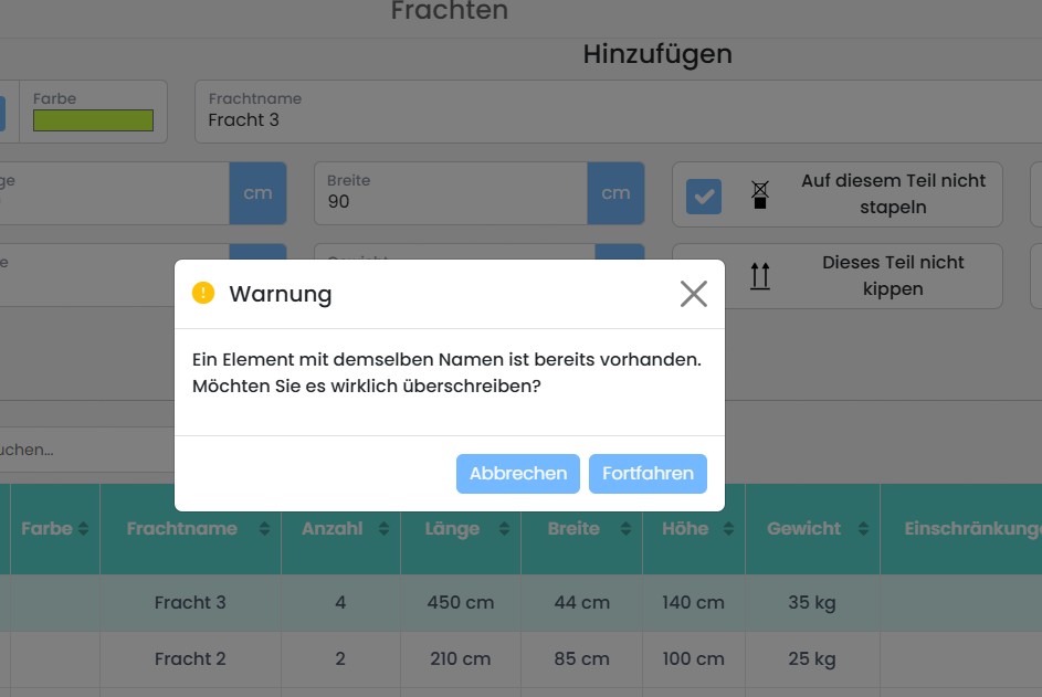 Wenn der aktualisierte Box Name bereits in der Datenbank vorhanden ist, zeigt das System eine Warnmeldung an, die fragt, ob das vorhandene Element überschrieben werden soll. Dieser Bestätigungsschritt hilft, versehentliche Aktualisierungen bestehender Elementdefinitionen zu verhindern.