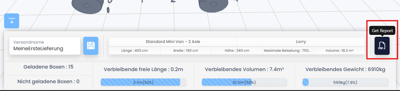 Nach Abschluss einer Sendung klicken Sie im unteren Bedienfeld auf die Schaltfläche Bericht abrufen (PDF-Symbol). Dadurch werden Sie auf die Berichtsseite weitergeleitet (https://app.cargoloader3d.com/Report).