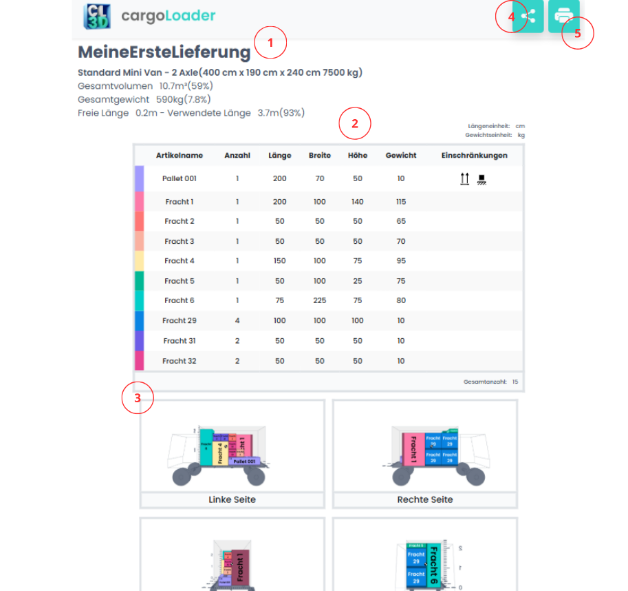 Zeigt den Sendungsnamen, den ausgewählten Fahrzeug- oder Containertyp (Abmessungen, Achsenzahl, Kapazität) und die wichtigsten Gesamtwerte an: