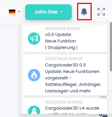 Zeigt die neuesten Updates und Ankündigungen an. Ein rotes Symbol weist auf ungelesene Elemente hin. Durch Klicken öffnet sich eine Liste mit Versionsaktualisierungen und neuen Funktionen.