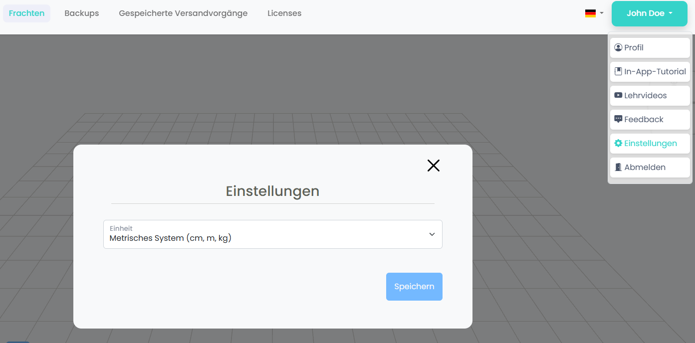 Um das Einheitensystem zu ändern, öffnen Sie das Einstellungsmenü über das Benutzermenü in der oberen rechten Ecke. Wählen Sie im Dropdown-Feld „Einheitentyp“ das gewünschte Messsystem aus. Nach der Auswahl klicken Sie auf „Speichern“, um die Änderung zu übernehmen. Das System konvertiert und zeigt automatisch alle relevanten Maße und Gewichte entsprechend an.