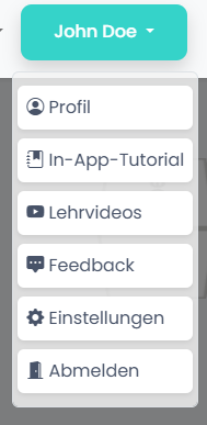 Wenn Sie auf Ihren Namen klicken, öffnet sich ein Dropdown-Menü mit Optionen wie Profil, In-App-Tutorial, Tutorial-Videos, Feedback, Einstellungen und Abmelden. Dies ermöglicht einen schnellen Zugriff auf persönliche Einstellungen und Supportressourcen.