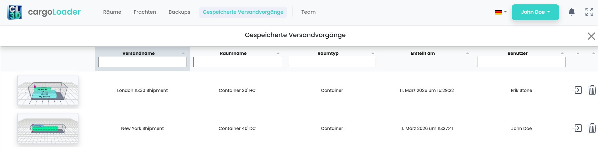 Nachdem Sie einen Laderaum ausgewählt und Ihre Artikel darin platziert haben, geben Sie im unteren Bedienfeld einen Namen in das Feld „Sendungsname“ ein. Klicken Sie anschließend auf das Speichersymbol (Diskette), um Ihre Arbeit als Sendung zu sichern.