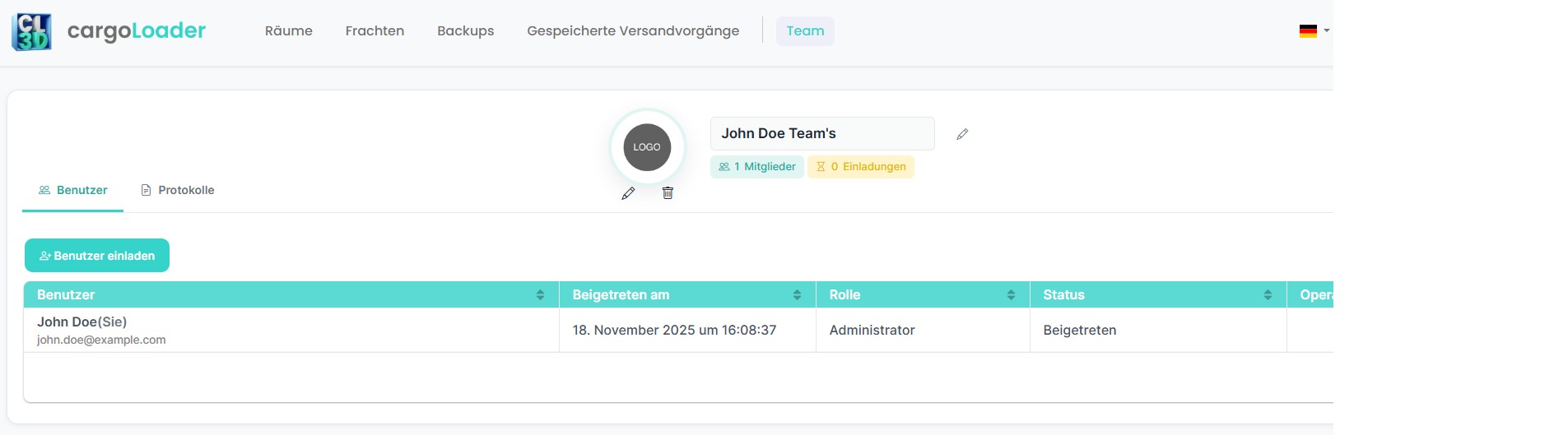 Der Bereich Teamverwaltung ermöglicht es Administratoren, Mitglieder des Arbeitsbereichs zu verwalten, neue Benutzer einzuladen und den Teamzugriff zu steuern. Diese Funktion erlaubt mehreren Benutzern die Zusammenarbeit innerhalb desselben CargoLoader-Arbeitsbereichs. Über diese Oberfläche können Administratoren Mitglieder einladen, den Status von Einladungen überwachen und bestehende Benutzer verwalten. Innerhalb des Arbeitsbereichs verfügen Editoren über erweiterte Berechtigungen, mit denen sie alle Items, Spaces und Shipments erstellen, bearbeiten und löschen können. Standardbenutzer hingegen können neue Items hinzufügen und nur die Items bearbeiten, die sie selbst erstellt haben, haben jedoch keine Berechtigung, Spaces zu erstellen.