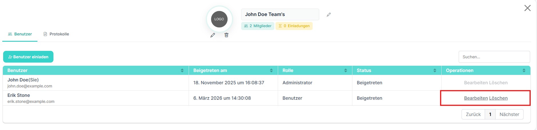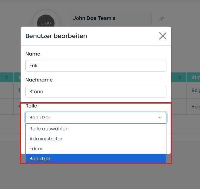Die Funktion „Edit User“ ermöglicht es Administratoren, Benutzerinformationen zu aktualisieren und Benutzerrollen innerhalb eines Teams zu ändern. Über diese Oberfläche können Administratoren Berechtigungen verwalten und sicherstellen, dass Teammitglieder über die passende Zugriffsebene verfügen.