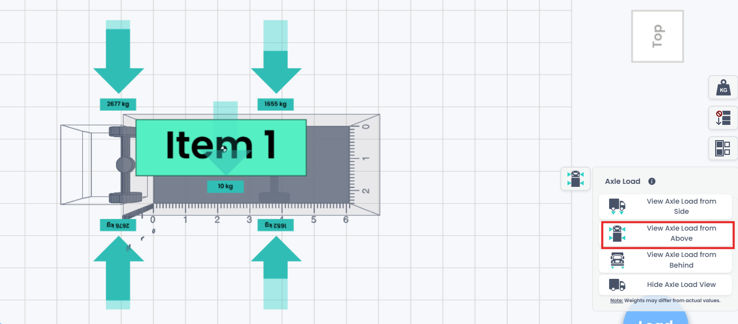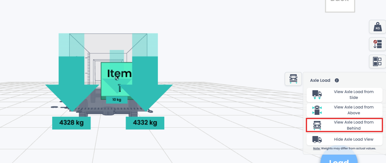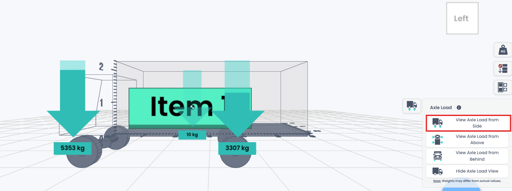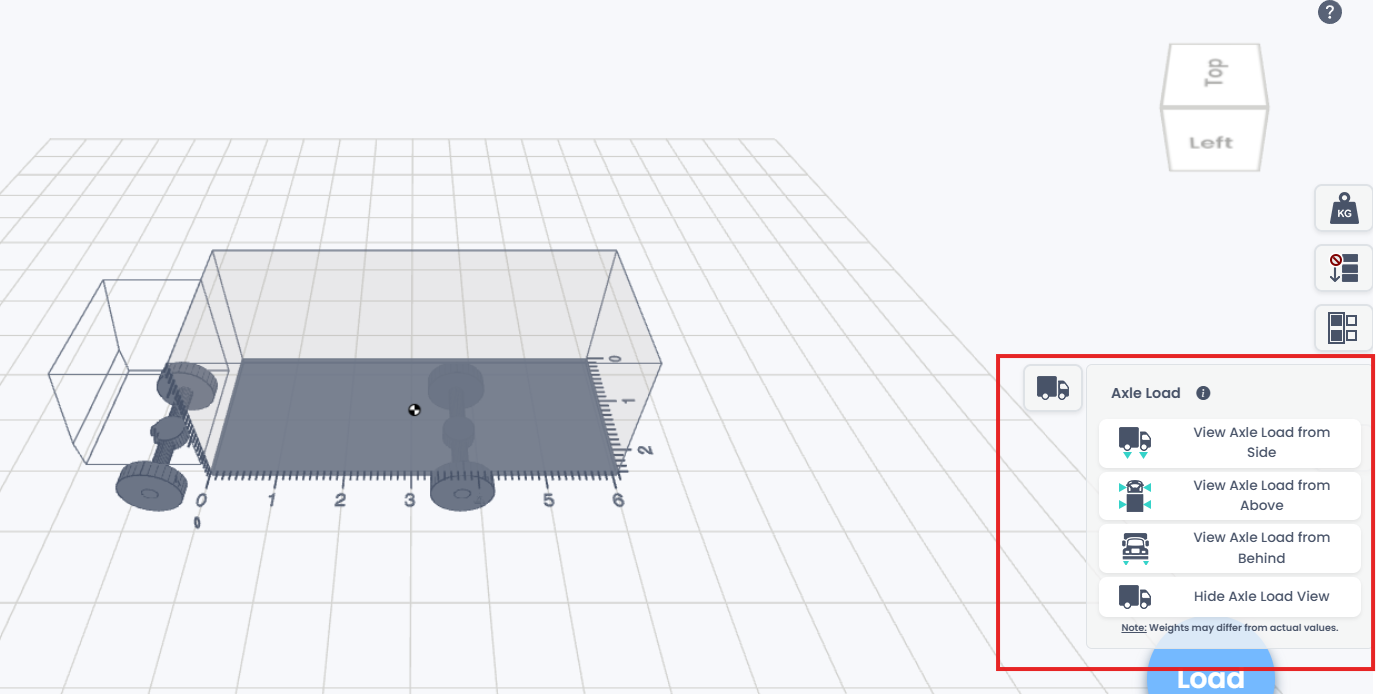 This view aggregates and labels the total load on all left-side axles and the total load on all right-side axles (units follow your Unit Settings: kg or lb). Values update in real time as cargo position changes.