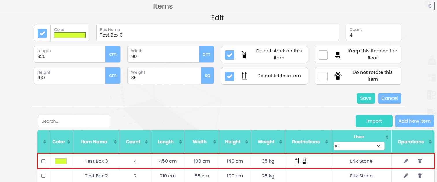 Use the Add Item panel to update the item properties. All attributes can be modified, including the Box Name, Color, Count, Length, Width, Height, Weight, and any item restrictions (such as stacking, tilting, rotation, or floor placement). After adjusting the required values, click Save to apply the changes.