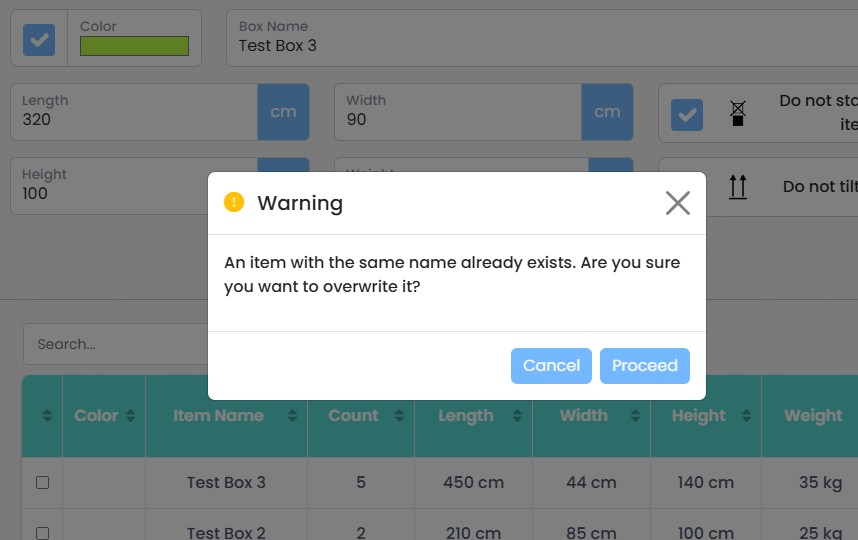If the updated Box Name already exists in the database, the system displays a warning message asking whether the existing item should be overwritten. This confirmation step helps prevent accidental updates to existing item definitions.