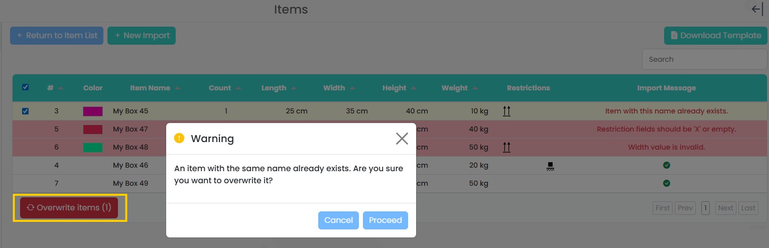 The Overwrite items button allows users to replace existing items in the database with the values from the imported file. When this option is used, the system checks whether an item with the same name already exists and displays a confirmation dialog.