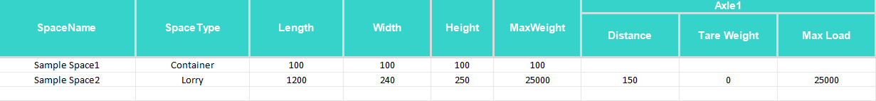 Both Sample Space 1 and Sample Space 2 demonstrate the fields that must be completed according to the selected Space Type (e.g., Container vs. Lorry/Semi-Trailer/Trailer). By default, a Space Type requires Length, Width, and Max Load values. The Axle count can also be customized in Excel, just as it can be configured when adding a new Space Type in the CargoLoader3D interface. Use these samples as a reference for the required columns and possible customizations for each type.