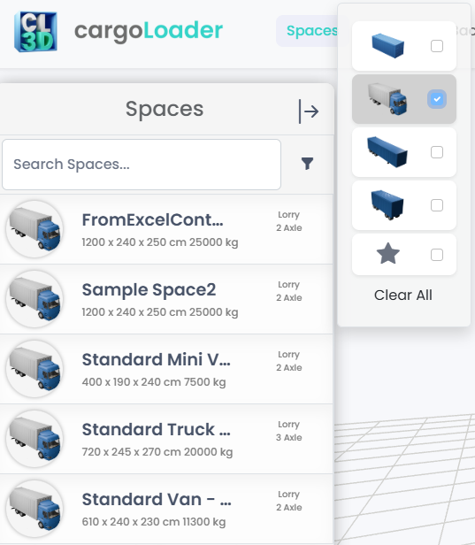 In CargoLoader, trucks and containers are managed under the Spaces panel. This section allows users to select the space type for the load plan, apply filters, search by name, and mark frequently used spaces as favorites.