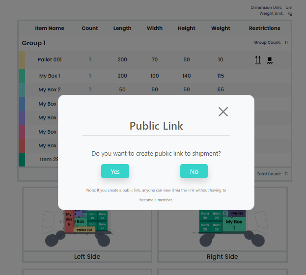 Create & Share: On the Report page, click Share (top-right). When prompted, confirm to generate a public link, then copy and distribute it. Anyone with the link can view the shipment—no login or registration required.Access remains available only while the sharing user’s license is active; if the license expires or sharing is disabled, the link will no longer be accessible.