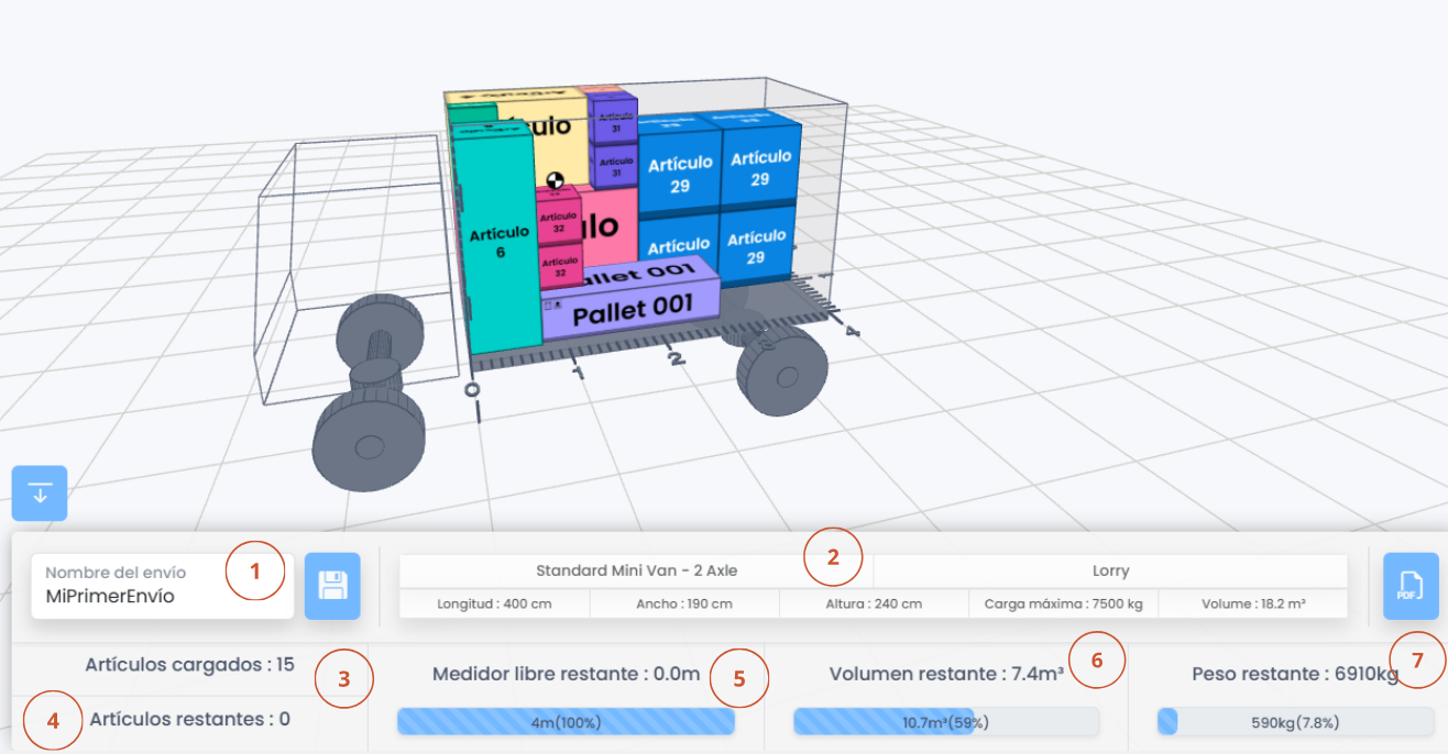 En la parte inferior de la pantalla encontrarás el Panel de Información del Contenedor. Este panel te ofrece información en tiempo real sobre tu envío y el uso del contenedor. Consulta el nombre del envío, el número de elementos, la longitud restante, el volumen y la capacidad de peso en el Panel de Información del Contenedor para validar la carga en tiempo real.