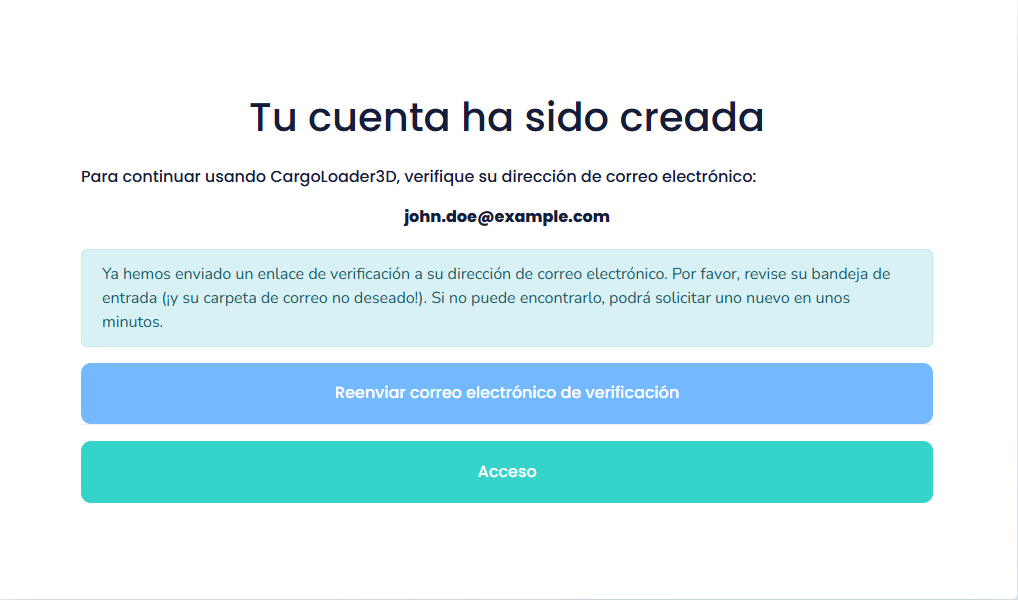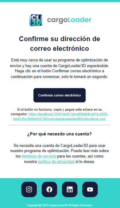 Una vez que recibas el correo de verificación, simplemente haz clic en el botón «Confirm Email» incluido en el mensaje. Tu cuenta será verificada con éxito y serás redirigido automáticamente a https://app.cargoloader3d.com/.