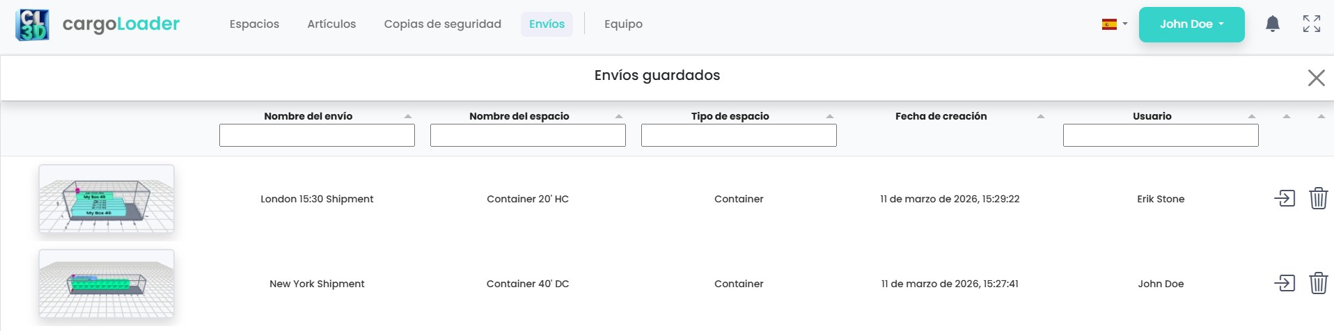 Una vez guardado, navega a la pestaña Envíos en el menú superior para acceder a todos los proyectos guardados; desde la lista, haz clic en cualquier fila (o en el Nombre del Envío) para abrir la página de detalles del envío.