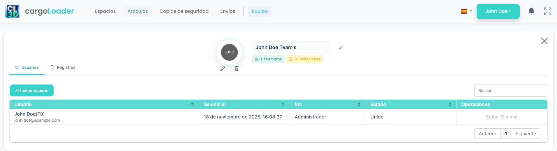 La sección Gestión del equipo permite a los administradores gestionar los miembros del espacio de trabajo, invitar a nuevos usuarios y controlar el acceso del equipo. Esta función permite que varios usuarios colaboren dentro del mismo espacio de trabajo de CargoLoader. A través de esta interfaz, los administradores pueden invitar a miembros, supervisar el estado de las invitaciones y gestionar a los usuarios existentes. Dentro del espacio de trabajo, los editores tienen permisos ampliados que les permiten crear, editar y eliminar todos los Items, Spaces y Shipments. Los usuarios estándar, por otro lado, pueden añadir nuevos Items y editar solo los Items que han creado, pero no tienen permiso para crear Spaces.