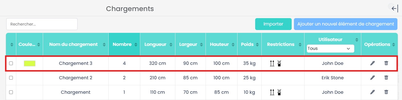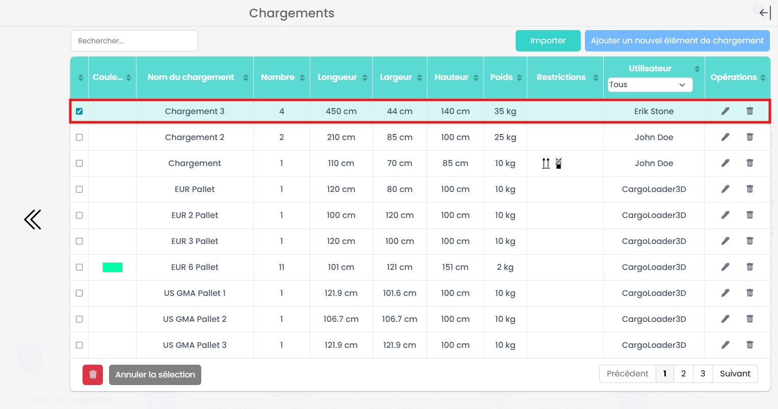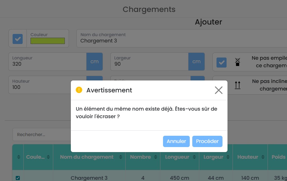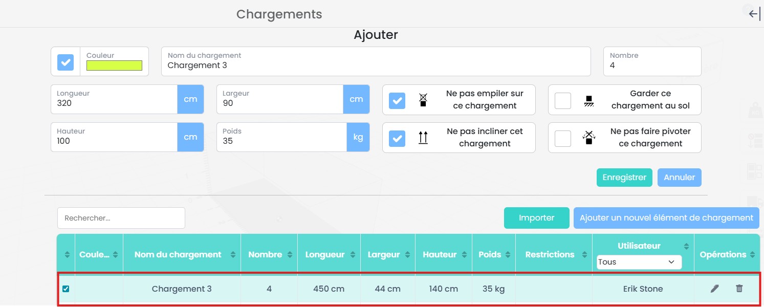 Si vous utilisez fréquemment les mêmes configurations d’éléments, vous pouvez les enregistrer dans la base de données au lieu de les recréer à chaque fois. Cela vous permet de sélectionner et de réutiliser rapidement des éléments prédéfinis, améliorant ainsi l’efficacité et la cohérence de vos plans de chargement.