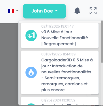 Affiche les dernières mises à jour et annonces. Un badge rouge indique les éléments non lus. En cliquant dessus, vous ouvrez la liste des mises à jour de version et des nouvelles fonctionnalités.
