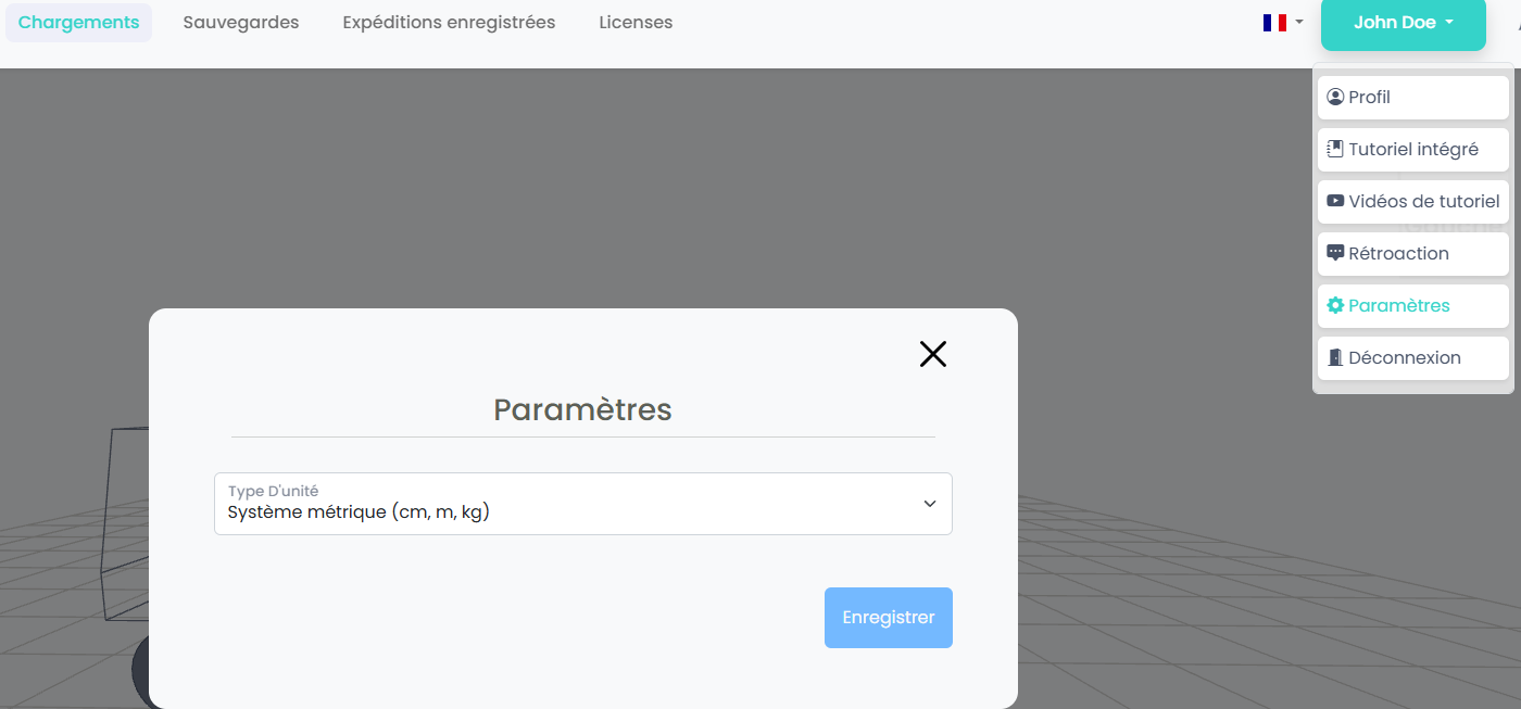 Pour modifier le système d’unités, ouvrez le panneau Paramètres à partir du menu utilisateur dans le coin supérieur droit. Dans la liste déroulante Type d’unité, sélectionnez le système de mesure souhaité. Après avoir effectué votre choix, cliquez sur le bouton Enregistrer pour appliquer la modification. Le système convertira et affichera automatiquement toutes les dimensions et tous les poids concernés.