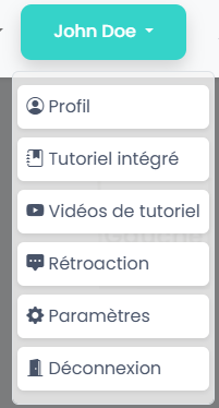 Cliquer sur votre nom ouvre un menu déroulant proposant des options telles que Profil, Tutoriel intégré, Vidéos de formation, Commentaires, Paramètres et Déconnexion. Cela permet un accès rapide aux réglages personnels et aux ressources d’assistance.