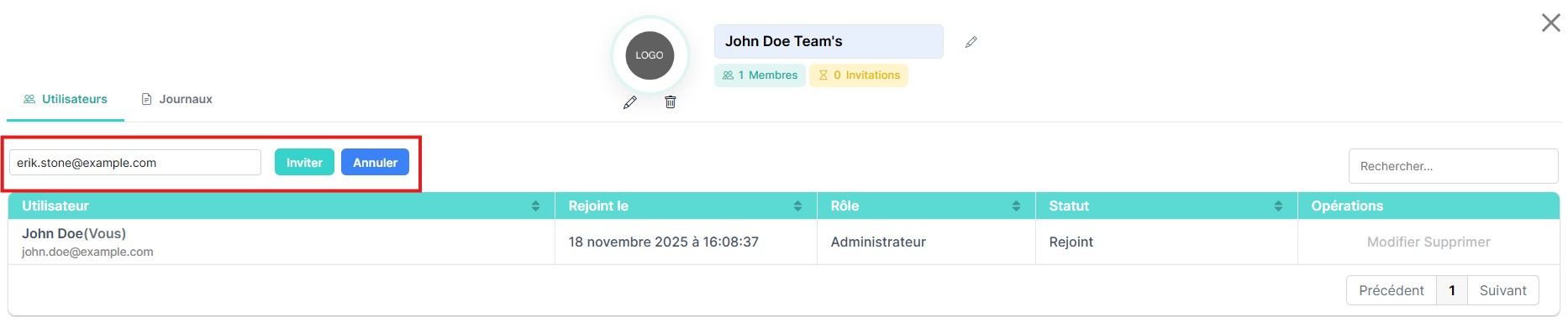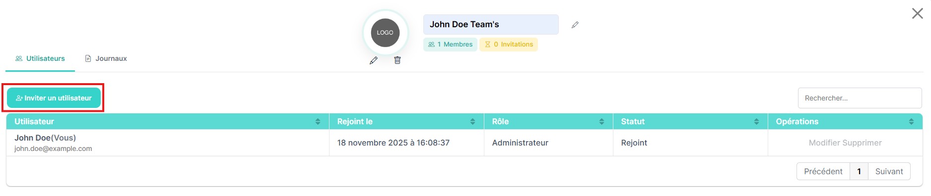 Pour inviter un nouvel utilisateur dans l’équipe, cliquez sur le bouton Invite User situé au-dessus du tableau des membres.