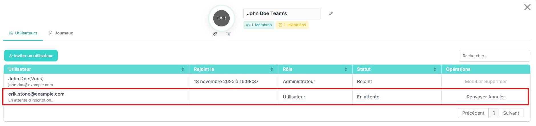 Après l’envoi de l’invitation, l’utilisateur invité apparaîtra dans la liste avec le statut Pending. Cela indique que l’invitation a été envoyée mais n’a pas encore été acceptée.