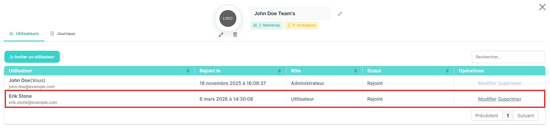 Une fois que l’utilisateur invité a terminé l’inscription, son statut passe de Pending à Joined. À ce stade, l’utilisateur devient un membre actif de l’équipe.