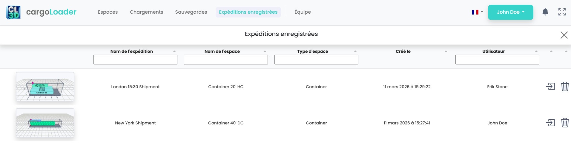 Une fois enregistrées, accédez à l’onglet Expéditions dans le menu supérieur pour consulter tous vos projets sauvegardés ; dans la liste, cliquez sur une ligne (ou sur le nom de l’expédition) pour ouvrir la page de détails correspondante.