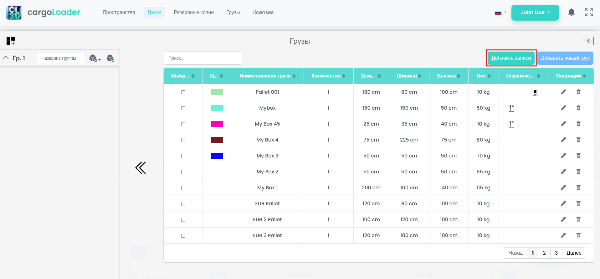 - Length / Width / Height: размеры в соответствии с настройками пользователя.