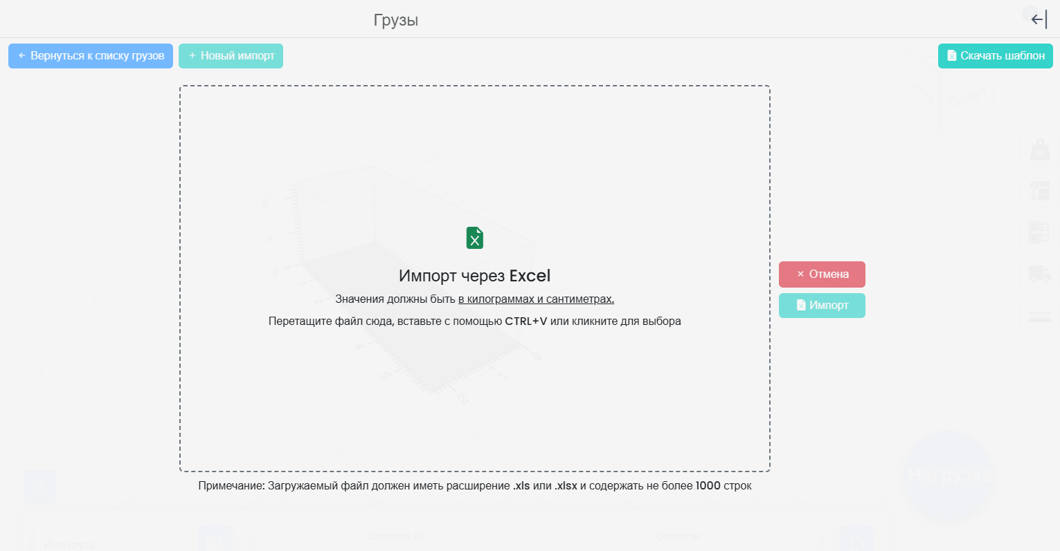 Если вы не уверены в правильном формате, нажмите «Скачать шаблон» (в правом верхнем углу). Это позволит получить готовый шаблон Excel с необходимыми названиями столбцов, что поможет избежать ошибок, таких как отсутствующие или неправильно названные колонки.