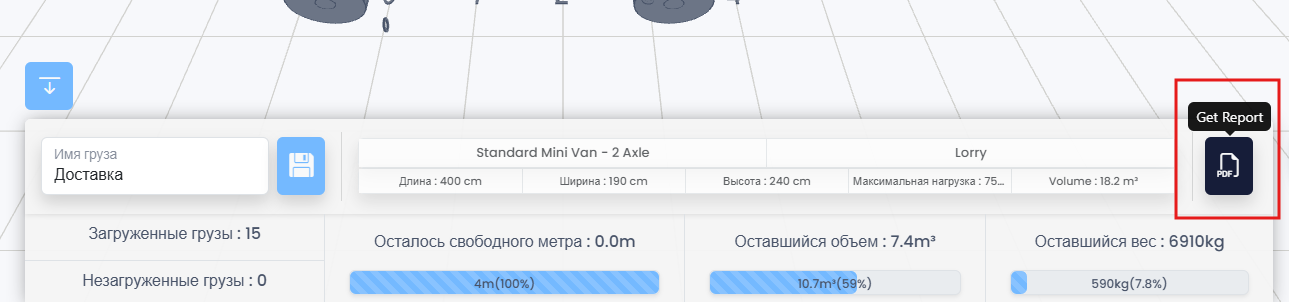 После завершения отгрузки нажмите кнопку «Получить отчет» (значок PDF) в нижней панели. Это перенаправит вас на страницу отчета (https://app.cargoloader3d.com/Report).