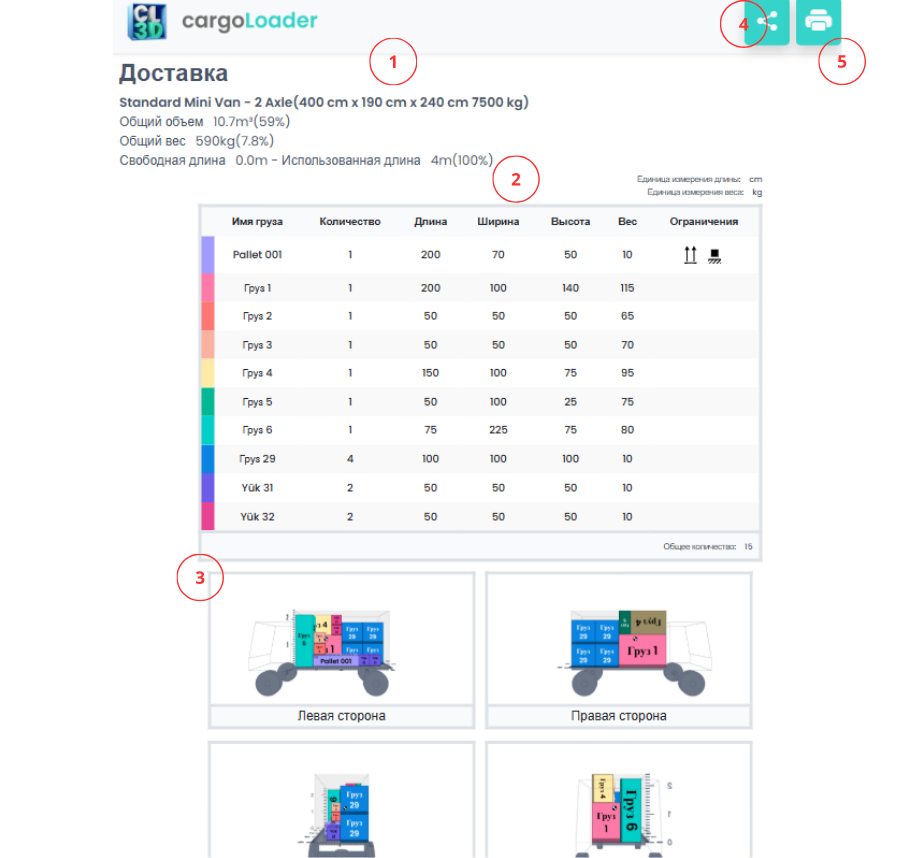 Отображает название отгрузки, выбранный тип транспортного средства или контейнера (размеры, количество осей, грузоподъемность) и основные итоги: