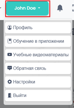 При нажатии на ваше имя открывается выпадающее меню с пунктами: Профиль, Встроенное обучение, Обучающие видео, Обратная связь, Настройки и Выход. Это обеспечивает быстрый доступ к персональным настройкам и материалам поддержки.