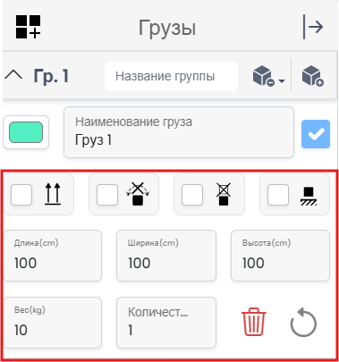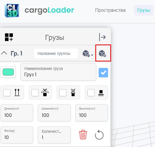 Нажмите кнопку «+» в выделенной области, чтобы добавить новый элемент в группу. Каждый элемент включает редактируемые параметры, такие как пользовательская метка, размеры (Д × Ш × В), вес, количество и цвет для 3D-визуализации. Кроме того, можно щелкнуть на любой элемент в плане загрузки, чтобы перейти в режим редактирования и изменить все его свойства.
