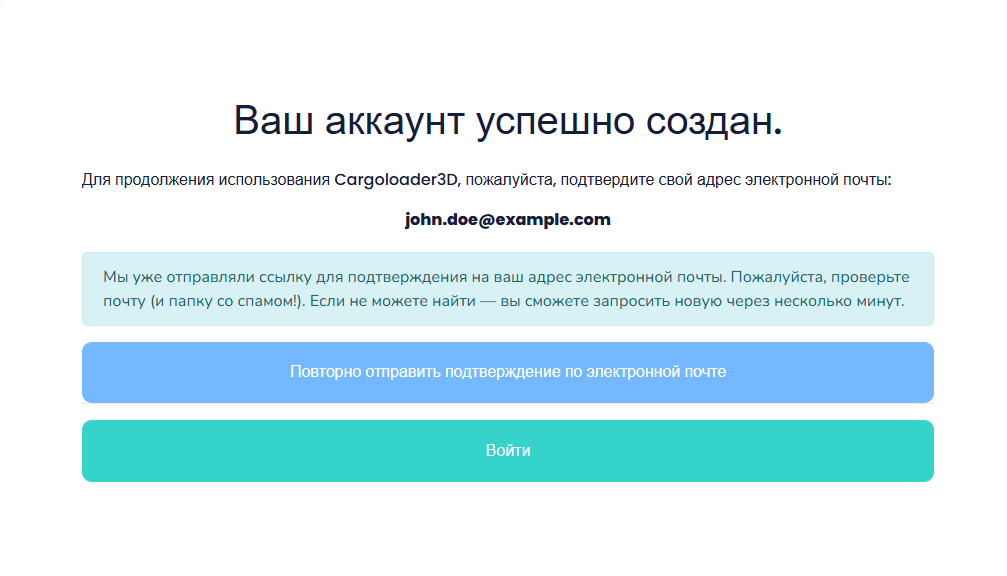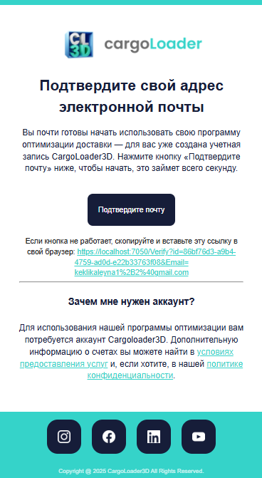 После получения письма просто нажмите кнопку «Confirm Email», указанную в сообщении. Ваш аккаунт будет успешно подтверждён, и вы будете автоматически перенаправлены на страницу https://app.cargoloader3d.com/.
