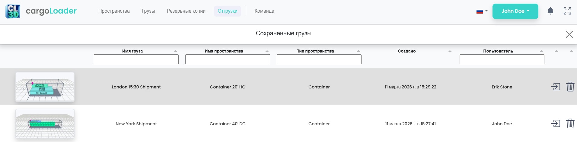 После сохранения перейдите на вкладку «Shipments» в верхнем меню, чтобы получить доступ ко всем сохранённым проектам. В списке нажмите на любую строку (или имя отгрузки), чтобы открыть страницу с её деталями.