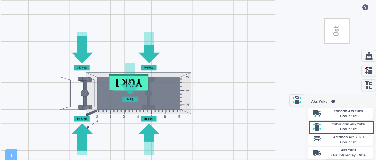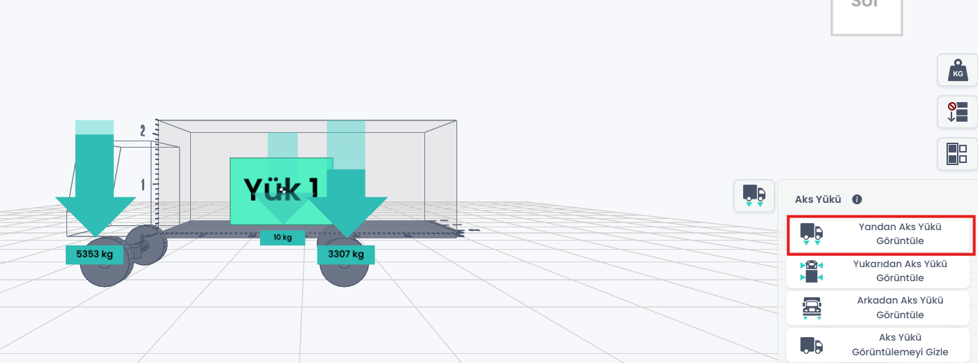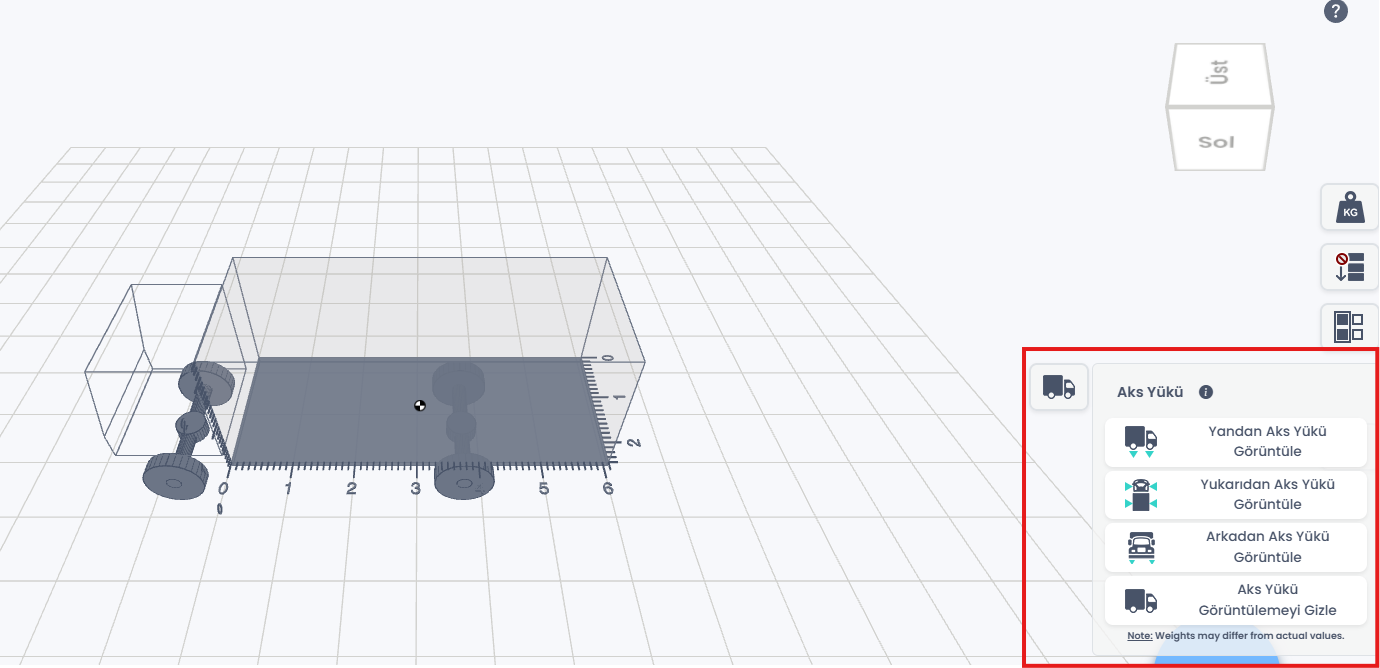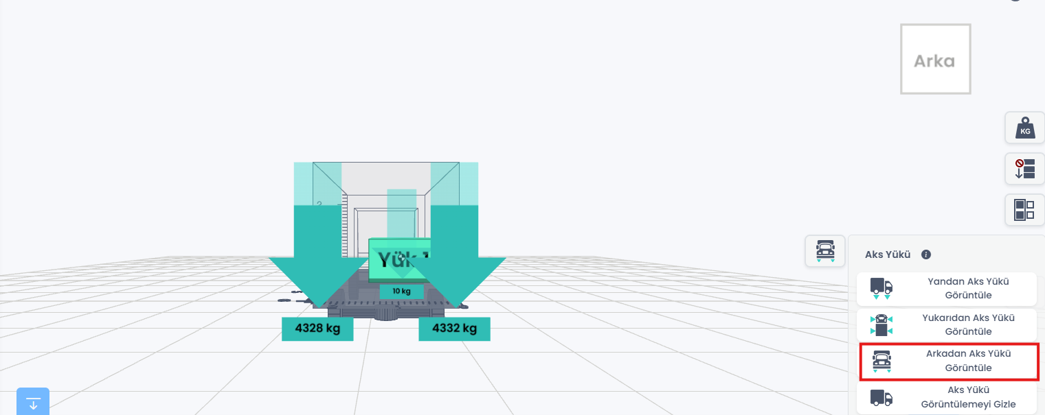 Bu görünüm, her bir aks üzerindeki yükü ayrı ayrı etiketler (birimler, Birim Ayarlarınıza göre kg veya lb cinsindedir). Amaç, yalnızca ön ve arka odaklanmak yerine, aks başına dağılımı doğrulamaktır.
