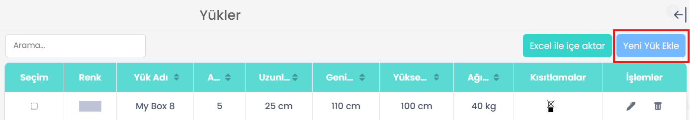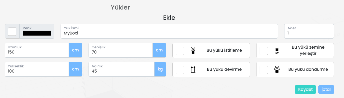 Aynı öğe yapılandırmalarını sık sık kullanıyorsanız, bunları her seferinde yeniden oluşturmak yerine veritabanına kaydedebilirsiniz. Bu sayede önceden tanımlanmış öğeleri hızlıca seçip yeniden kullanabilir, yükleme planlarınızda verimlilik ve tutarlılık sağlayabilirsiniz.