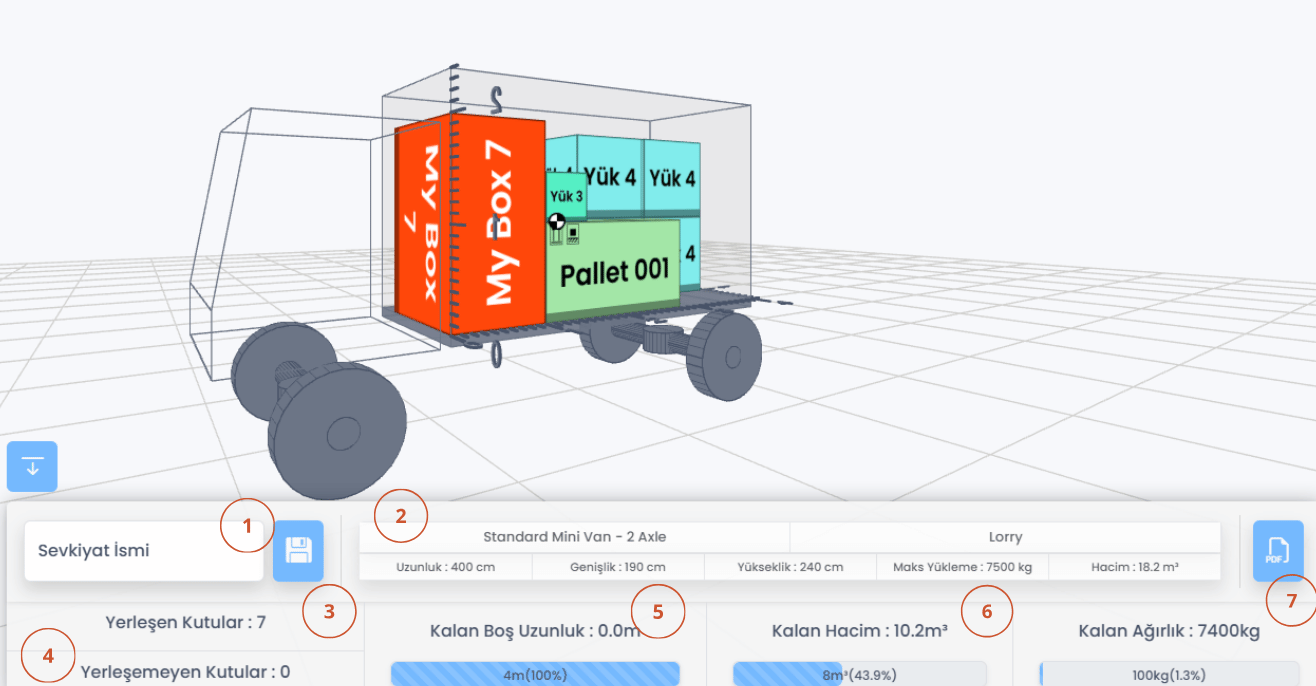 Bu değerler, sevkiyatınızı her ayarladığınızda veya yeniden yüklediğinizde dinamik olarak güncellenir ve konteyner verimliliği hakkında anında geri bildirim sağlar.
