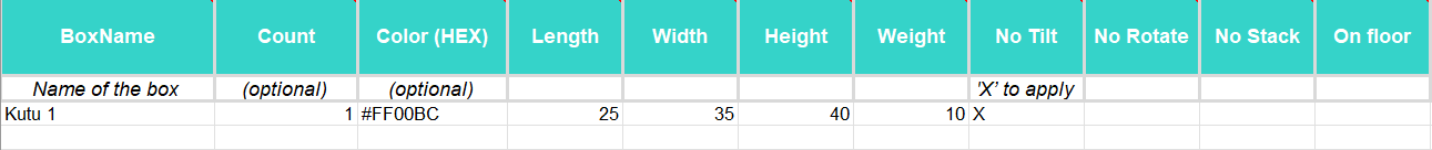 - No Tilt / No Rotate / No Stack / On Floor: Kısıtlamalar (etkinleştirmek için X işareti koyun).