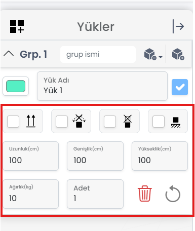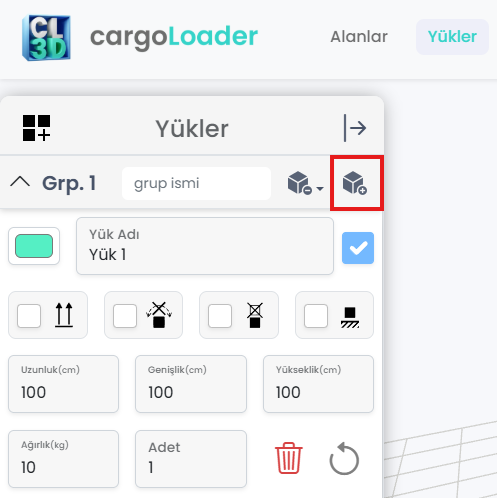 Vurgulanan alandaki '+' düğmesine tıklayarak gruba yeni bir öğe ekleyebilirsiniz. Her öğe, özel etiket, boyutlar (U × G × Y), ağırlık, miktar ve 3D görselleştirme için renk gibi düzenlenebilir parametreler içerir. Ayrıca yük planındaki herhangi bir öğeye tıklayarak Düzenleme moduna girebilir ve tüm özelliklerini değiştirebilirsiniz.